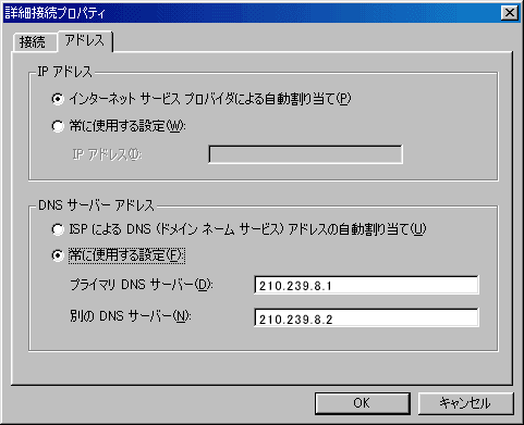 6.「詳細設定のプロパティ」の画面が表示されます。「IPアドレス」の項目は「インターネットサービスプロバイダによる自動割り当て」のままで、「DNSサーバーアドレス」の項目を「常に使用する設定」にチェックを入れ、下記のように設定してください。