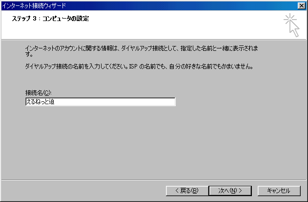 8.「ステップ3:コンピューターの設定」の画面が表示されます。「接続名」は任意の名前で構いませんが、ここでは「えるねっと迫」と入力します。