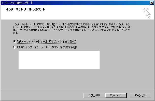 10.「インターネットメールアカウント」の画面が表示されますので、「新しいインターネットメールアカウントを作成する」をチェツクして「次へ」をクリックしてください。
