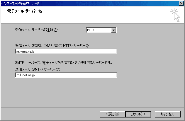 ●受信メール(POP3、IMAPまたはHTTP)サーバー:「mail.l-net.ne.jp