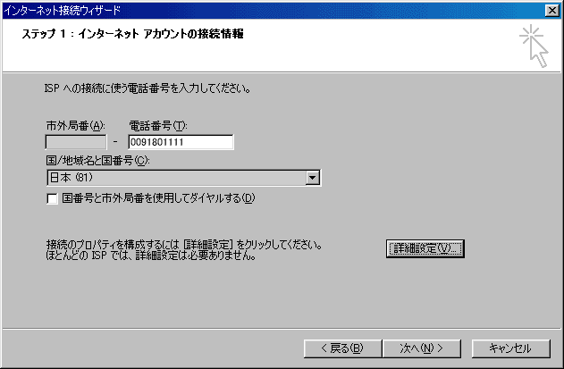 5.「ステップ1:インターネットアカウントの接続情報」の画面が表示されますので、えるねっと迫アクセスポイントの電話番号を半角で入力しください。