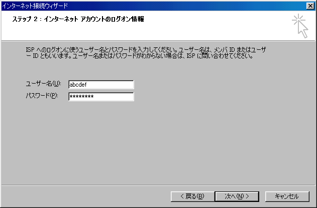 7.「ステップ2:インターネットアカウントのログオン情報」の画面が表示されますので下記のように設定ください。