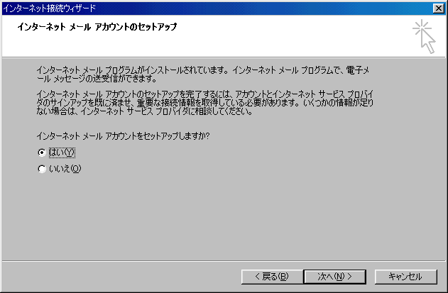 9.「インターネットメールアカウントのセットアップ」の画面が表示されますので、「はい」をチェツクして「次へ」をクリ