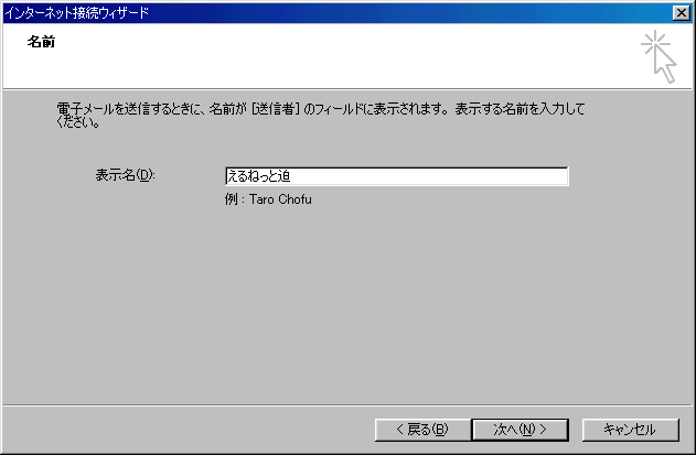 11.「名前」の画面が表示されますので、「表示名」に、あなたのお名前やニックネームなどお好きな文字列を入力してください。
