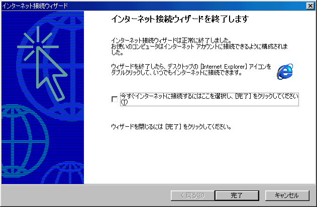 チェツクをはずし「完了」をクリックします。これで、インターネット接続とメールの設定は完了です。